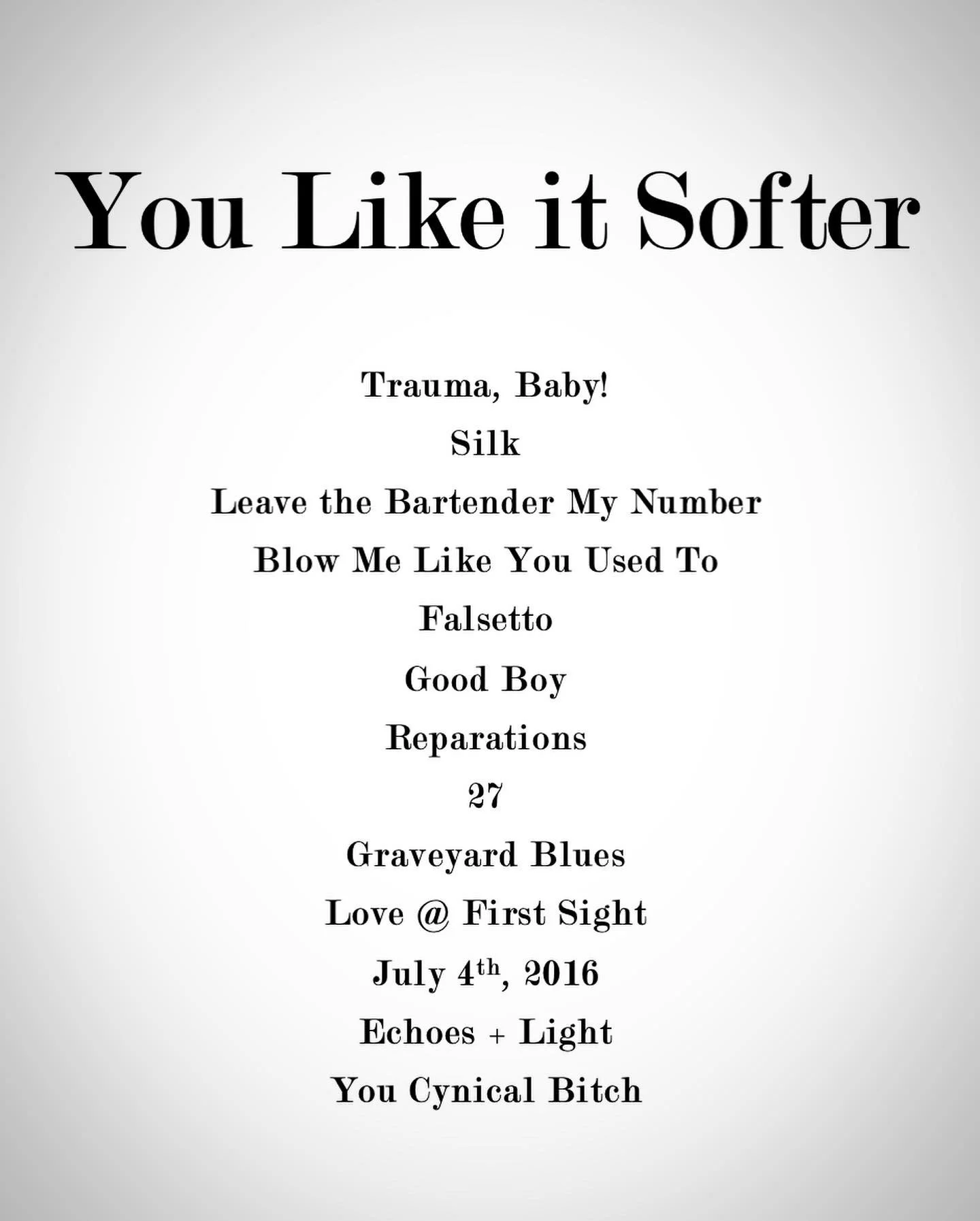 The writing was finished just before I turned 28, marking a year of self-reflection and growth. When I finished writing these thirteen tracks, I felt like an entirely different person. Having documented these experiences, I began to grow and distance myself from them. The heaviest weights I’d been carrying for years fell off my shoulders. You Like it Softer taught me how to expand my writing and storytelling, as well as the healing power of music.